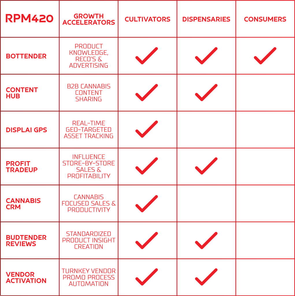 RPM420 is a comprehensive platform for driving profitable cannabis growth for Cultivators & Dispensaries through several high-value integrated solutions, including: